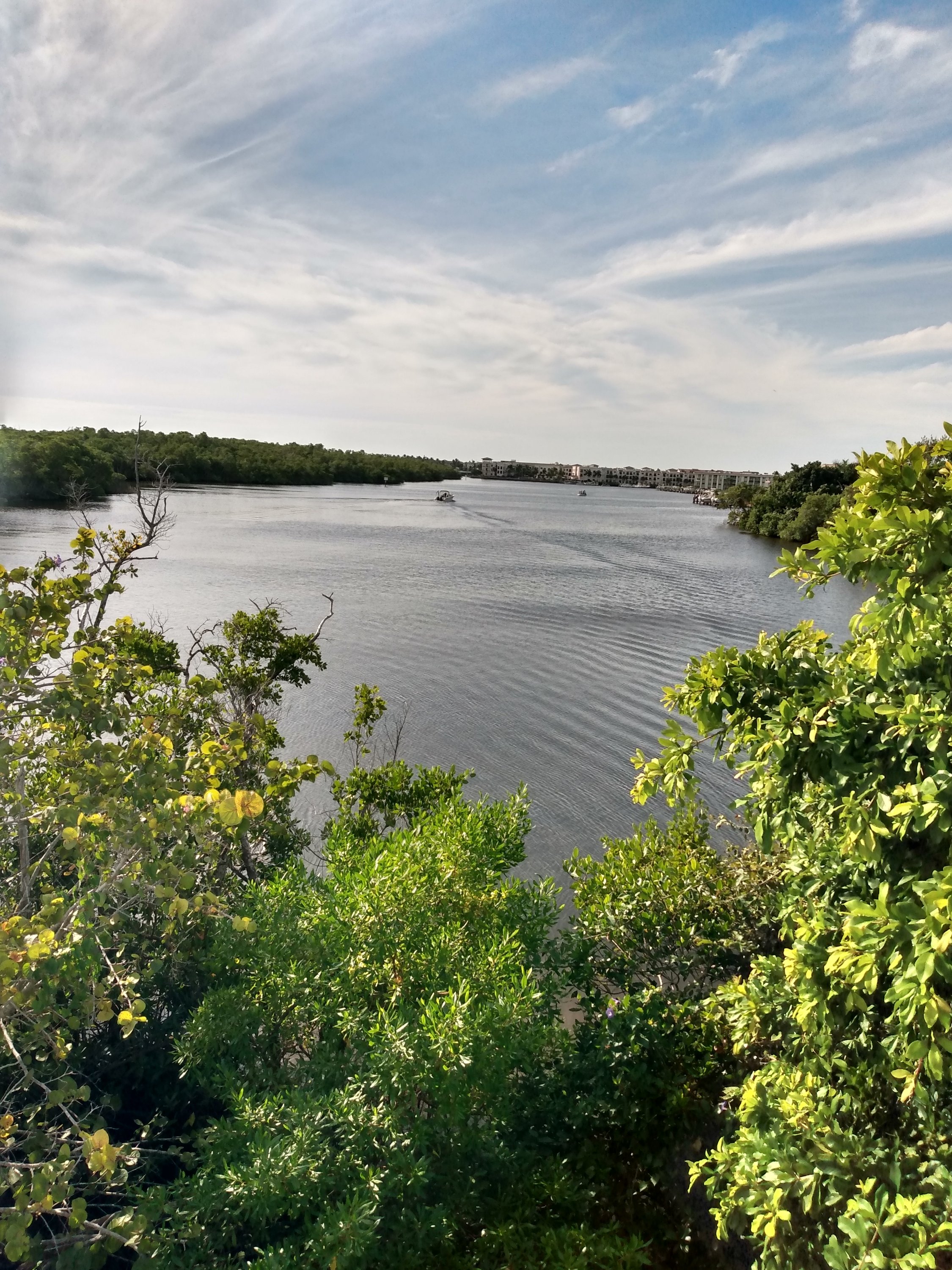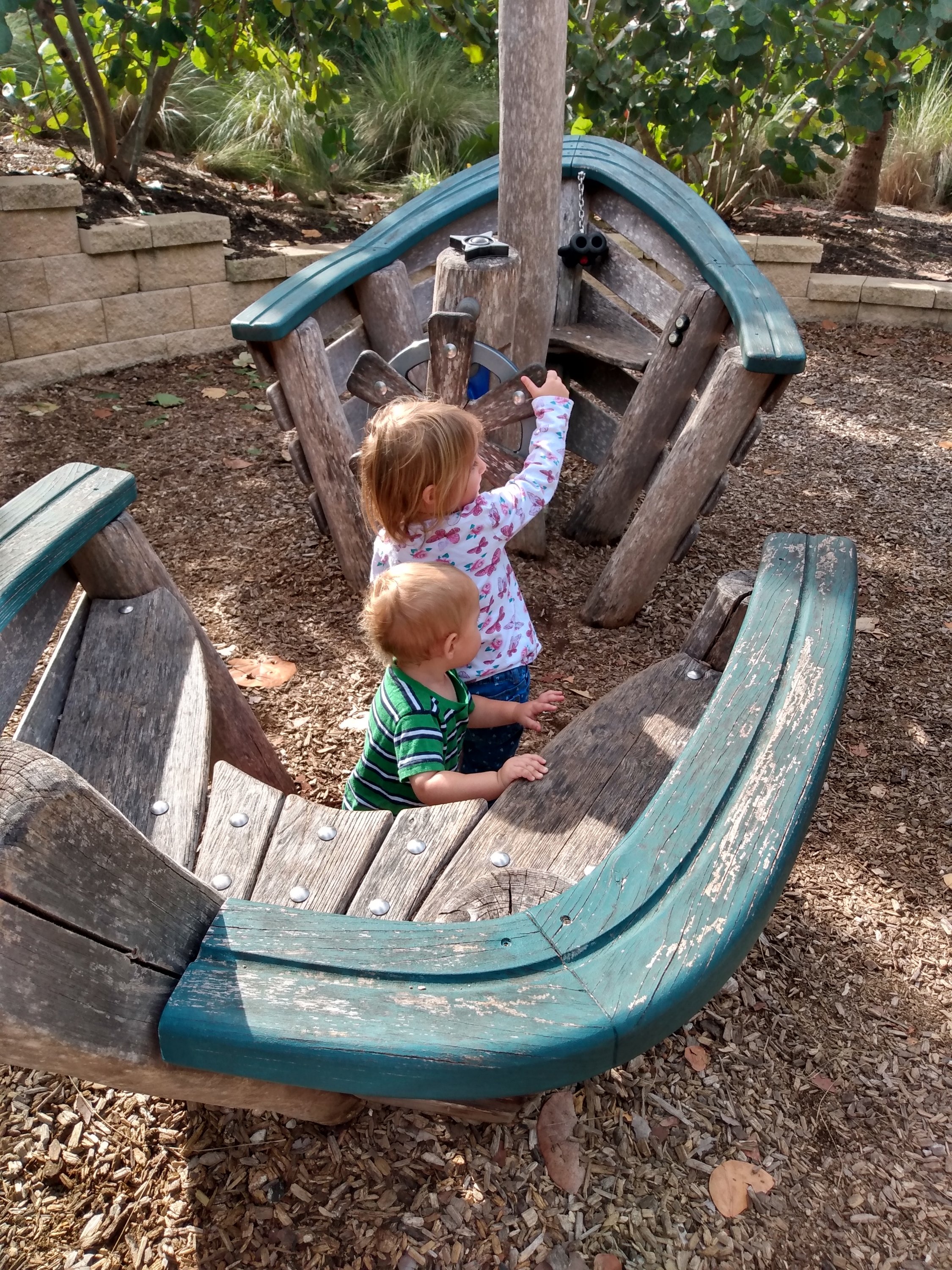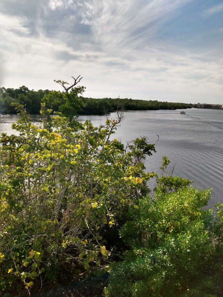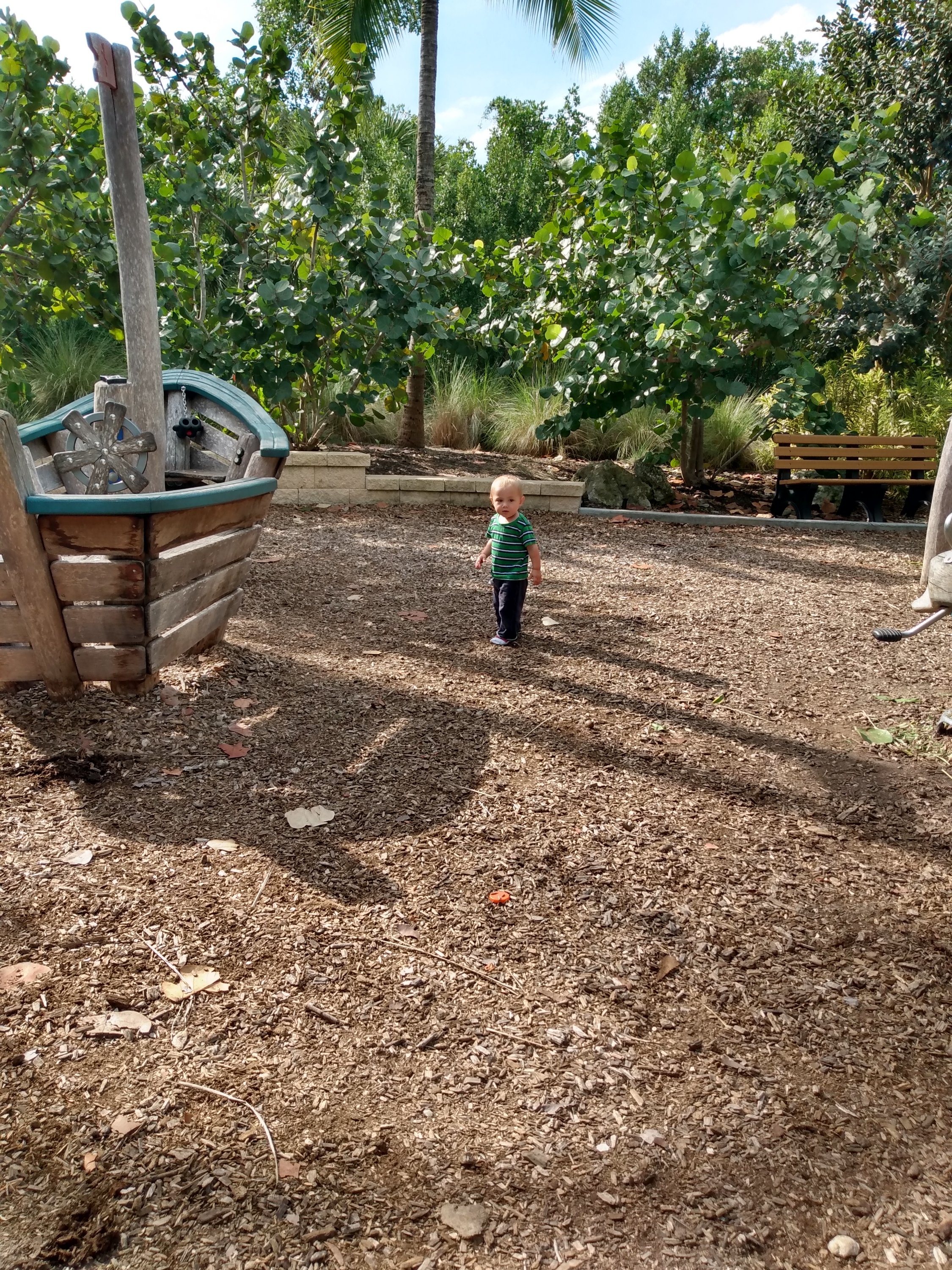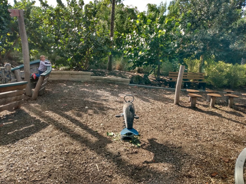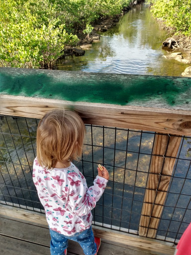 Situated near Old Naples, Baker Park is a perfect balance of hip city life and the natural beauty that makes Southwest Florida a vacation hotspot. While there are a number of things that families can do at this park, our family enjoys it in our own unique way. This morning I just had my two youngest, 3 & 1. I started off by lugging out my Joovy double stroller. Once the kids were situated and given snacks and drinks we took off toward the bridge over the Gordon River. A beautiful great blue heron flew overhead. On the bridge we saw boats passing under and more off in the distance.